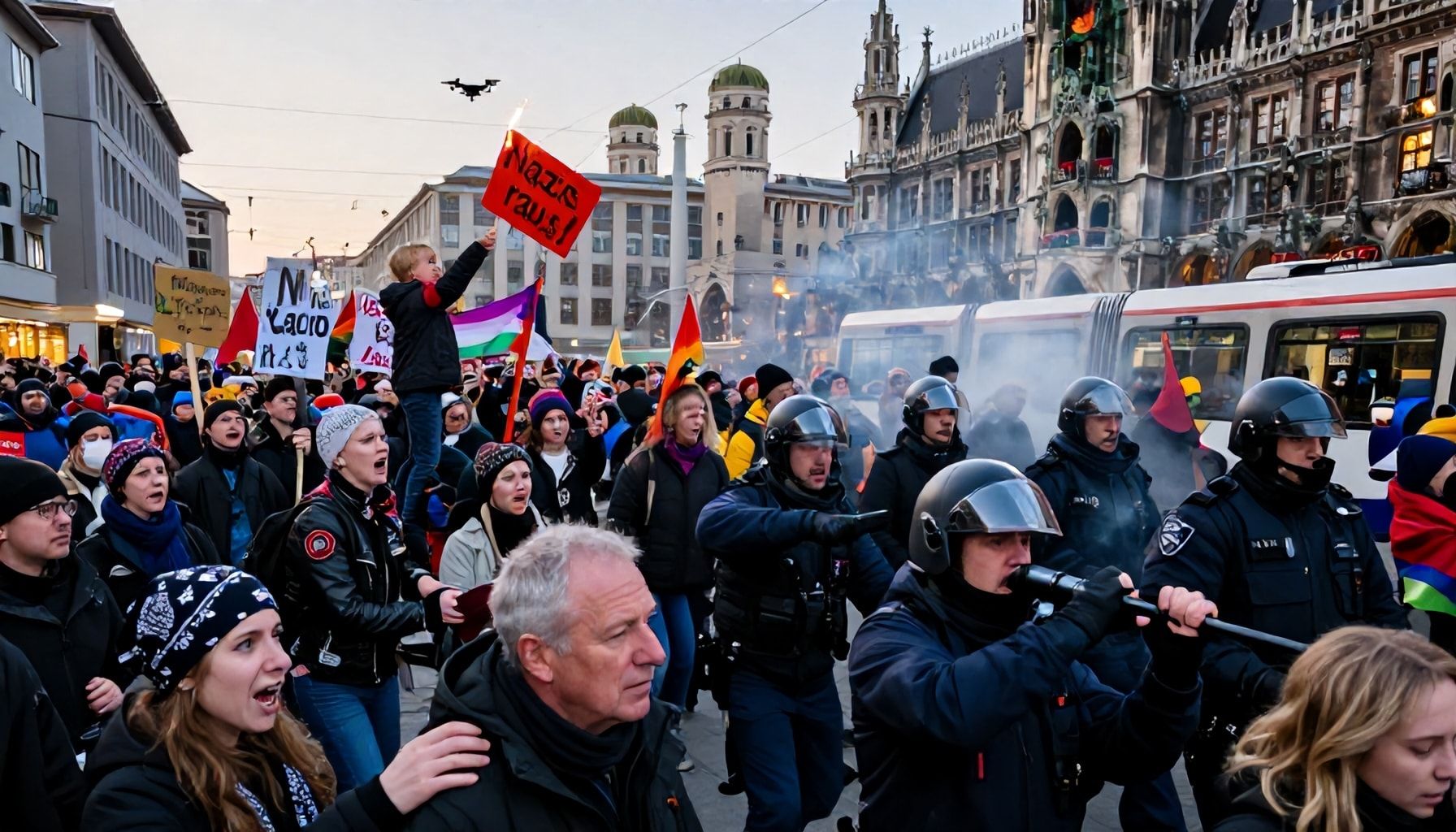 Die zunächst friedliche Stimmung auf der Münchner Großdemo gegen Rechtsextremismus kippte am späten Nachmittag, als eine Gruppe von etwa 200 Vermummten am Odeonsplatz begann, Barrikaden aus Mülltonnen und Absperrgittern zu errichten. Augenzeugen berichteten von gezielten Provokationen gegen die Polizei, die daraufhin mit Lautsprecherdurchsagen zur Auflösung aufforderte. Als die Situation eskalierte, setzte die Bereitschaftspolizei Pfefferspray ein, um die Menge zurückzudrängen. Mehrere Demonstranten warfen Flaschen und Pyrotechnik in Richtung der Beamten, wie Videomaterial lokaler Medien zeigt.