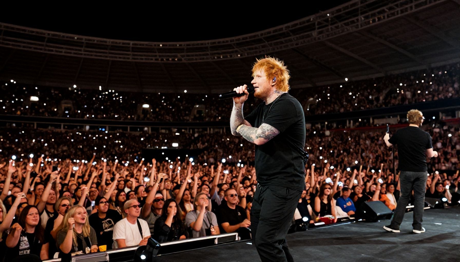 Das Münchner Olympiastadion schrieb gestern Geschichte. Als Ed Sheeran die Bühne betrat, brandete ein Jubel auf, der selbst erfahrene Konzertveranstalter überraschte. Mit 70.000 Besuchern war die Arena bis auf den letzten Platz gefüllt – eine Zahl, die selbst die Rekordbesuche von U2 oder Coldplay in den Schatten stellte. Die Atmosphäre war elektrisch, als die ersten Klänge von „Perfect“ durch die Abendluft hallten und das Publikum synchron mitsang.