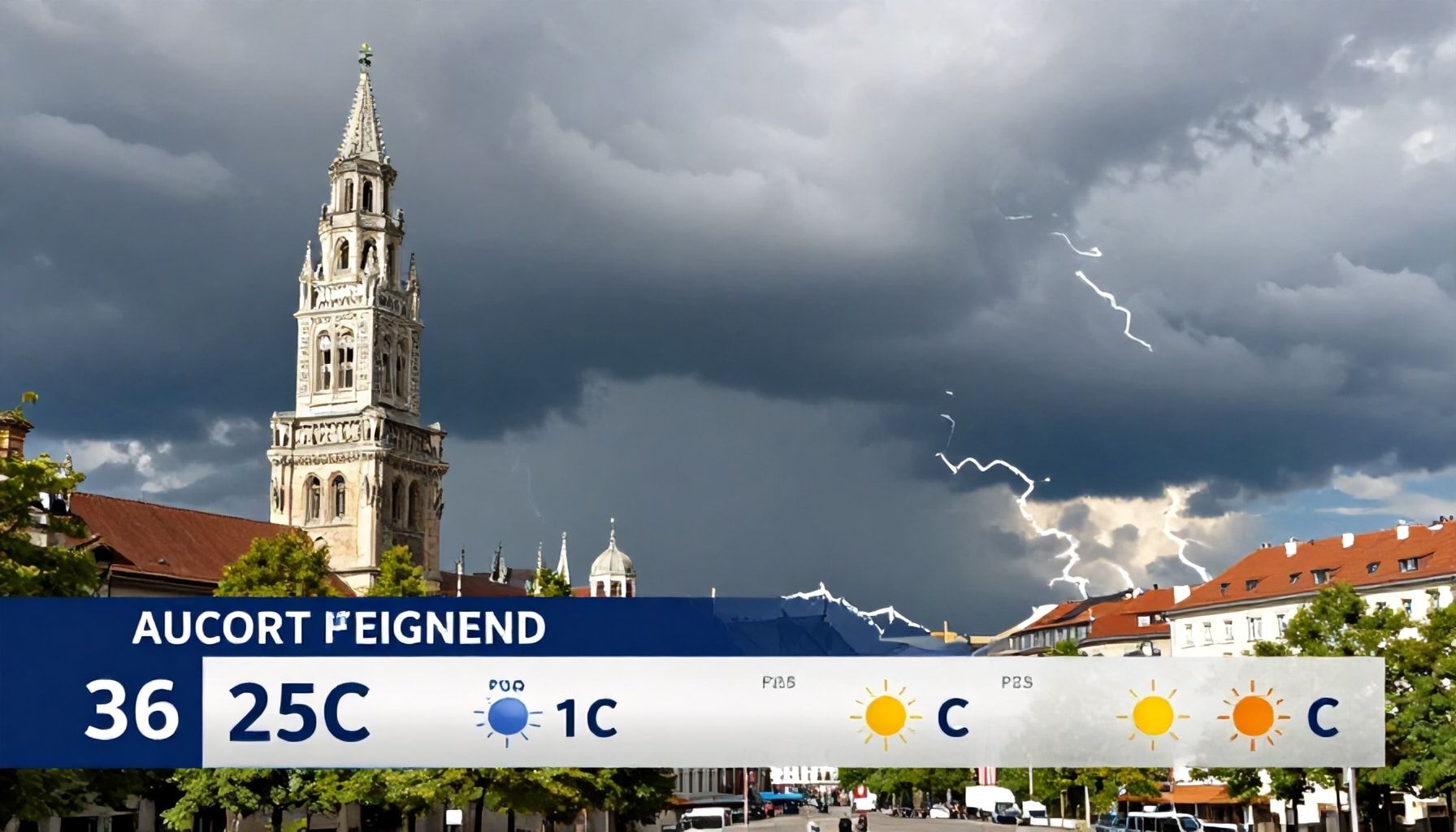 Am Sonntag beruhigt sich die Lage vorerst. Zwar halten sich dichte Wolkenfelder, doch die Schaueraktivität lässt deutlich nach. Nur im Alpenvorland – etwa in Richtung Bad Tölz oder Miesbach – bleibt ein geringes Restrisiko für vereinzelte Blitzentladungen. Die Temperaturen sinken leicht auf 22 bis 24 Grad, was die Gewitterneigung weiter reduziert.