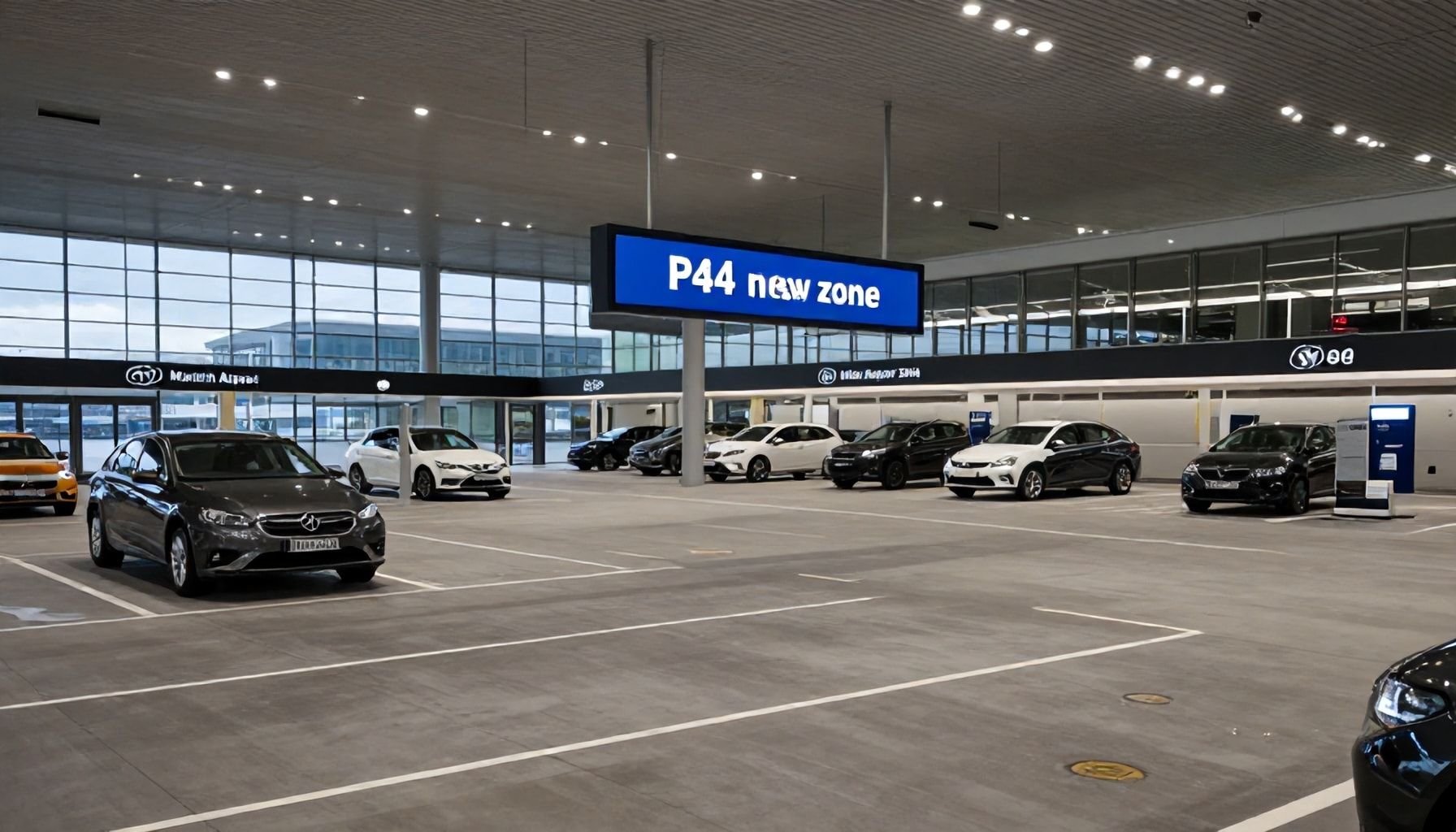 Für die Rückfahrt zum Parkplatz stehen an den Terminals deutlich gekennzeichnete Shuttle-Haltestellen bereit, an denen die Busse ebenfalls im 10-Minuten-Intervall abfahren. Die Beschilderung folgt dem einheitlichen Farbsystem des Flughafens – P44 ist mit der Farbe Dunkelblau markiert, was die Orientierung auch für Erstbesucher vereinfacht.