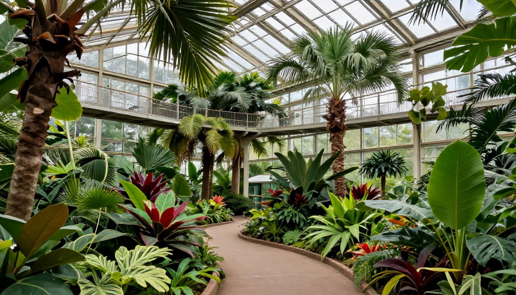 Besonders beeindruckend ist das Hauptgewächshaus mit seiner kuppelförmigen Konstruktion. Es beherbergt eine vielfältige Sammlung tropischer Pflanzen, darunter seltene Orchideen und Farne. Die transparente Architektur ermöglicht natürliches Licht und schafft eine offene, einladende Atmosphäre. Besucher können die Pflanzen aus nächster Nähe betrachten und mehr über ihre ökologische Bedeutung erfahren.